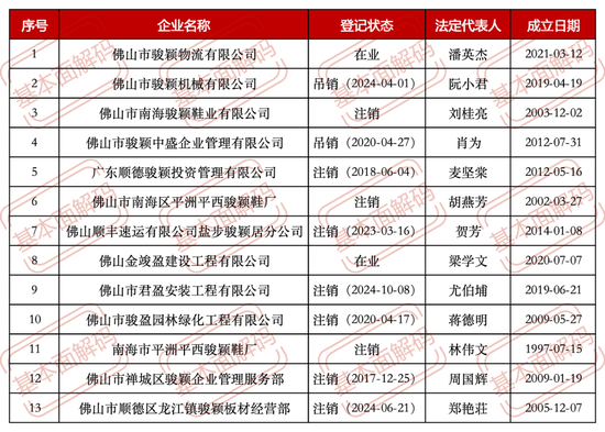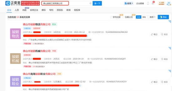 图片来源:企查查 (二)“佛山骏颖工程有限公司”:13条结果无一命中 “企查查”搜索“骏颖工程”关键词共检索到13条相关企业信息,但无一家公司完整名称与“佛山骏颖工程有限公司”完全匹配。部分公司虽成立时间在康天伦任职前,但公司名称描述或不符,如“佛山市顺德区骏颖电器有限公司”等。这意味着披露信息缺乏可验证的登记信息,不符合《证券法》第七十八条关于“发行人应当真实、准确、完整披露信息”的要求。