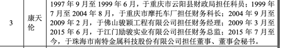图片来源:北交所项目动态 三段履历疑点重重:三家公司公开信息均查无此企业 据光大证券保荐代表人申晓毅、詹程浩撰写南特科技招股书(上会稿)显示,现任董事、董事会秘书康天伦的职业经历显示,其曾在三个单位任职: 1.1999年7月至2004年8月,就职于“重庆市摩托车厂”,担任财务科长; 2.2004年9月至2009年2月,就职于“佛山骏颖工程有限公司”,担任财务经理; 3.2009年3月至2015年6月,就职于“江门励骏实业有限公司”,担任财务总监。